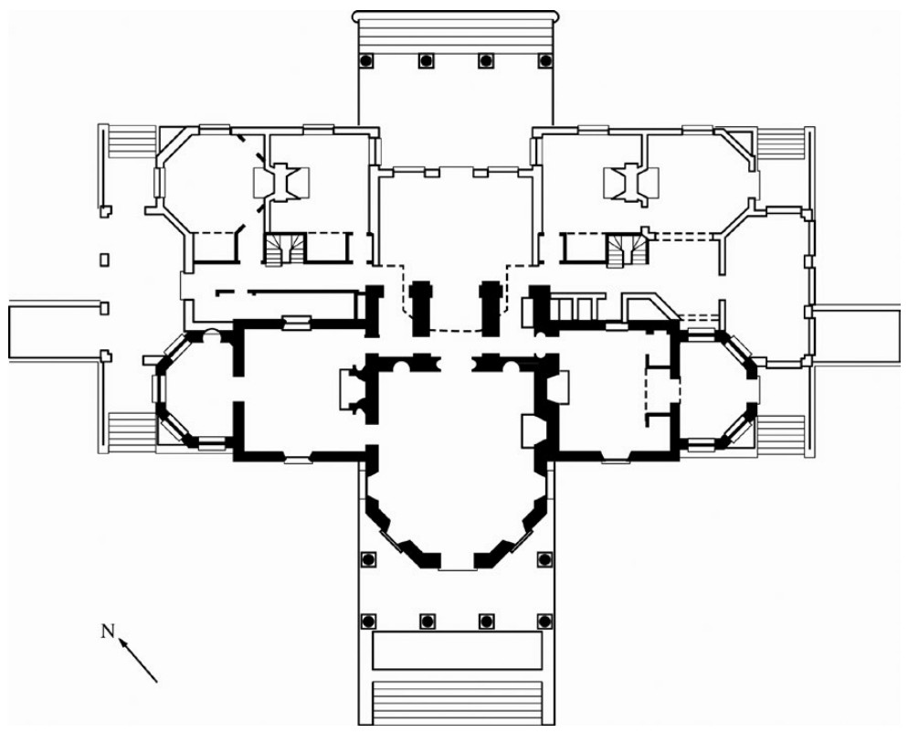 - Neoclassical style featuring a Doric portico and central dome.