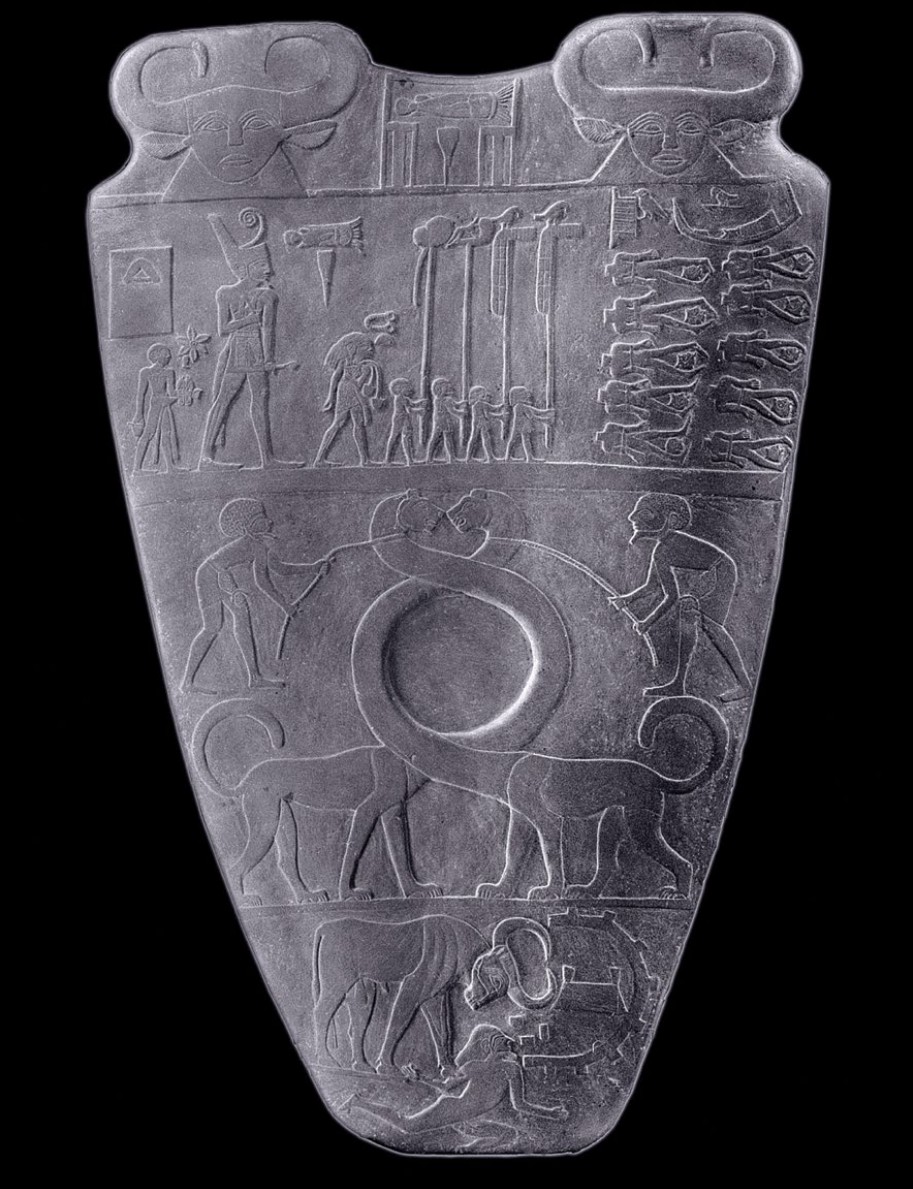 - Back (Lower Egypt side): Narmer wears the Red Crown, marching in a victory procession viewing beheaded enemies.