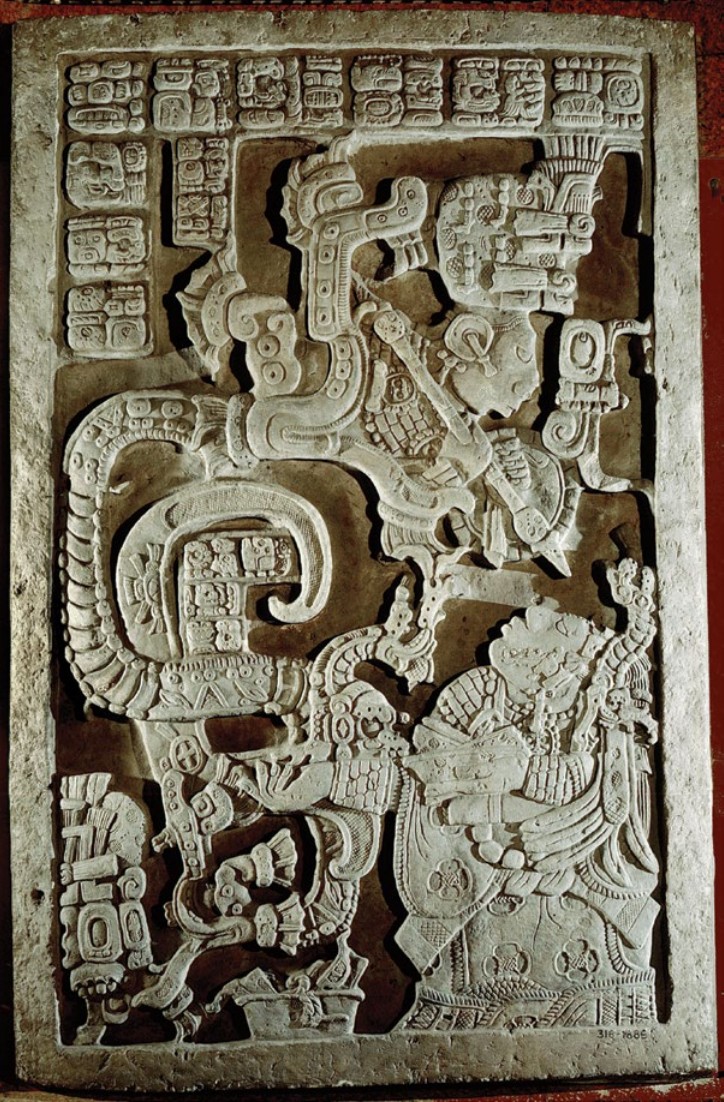 - Lintel 25: Lady Xook (Queen) kneels before a Vision Serpent rising from a blood-bowl.