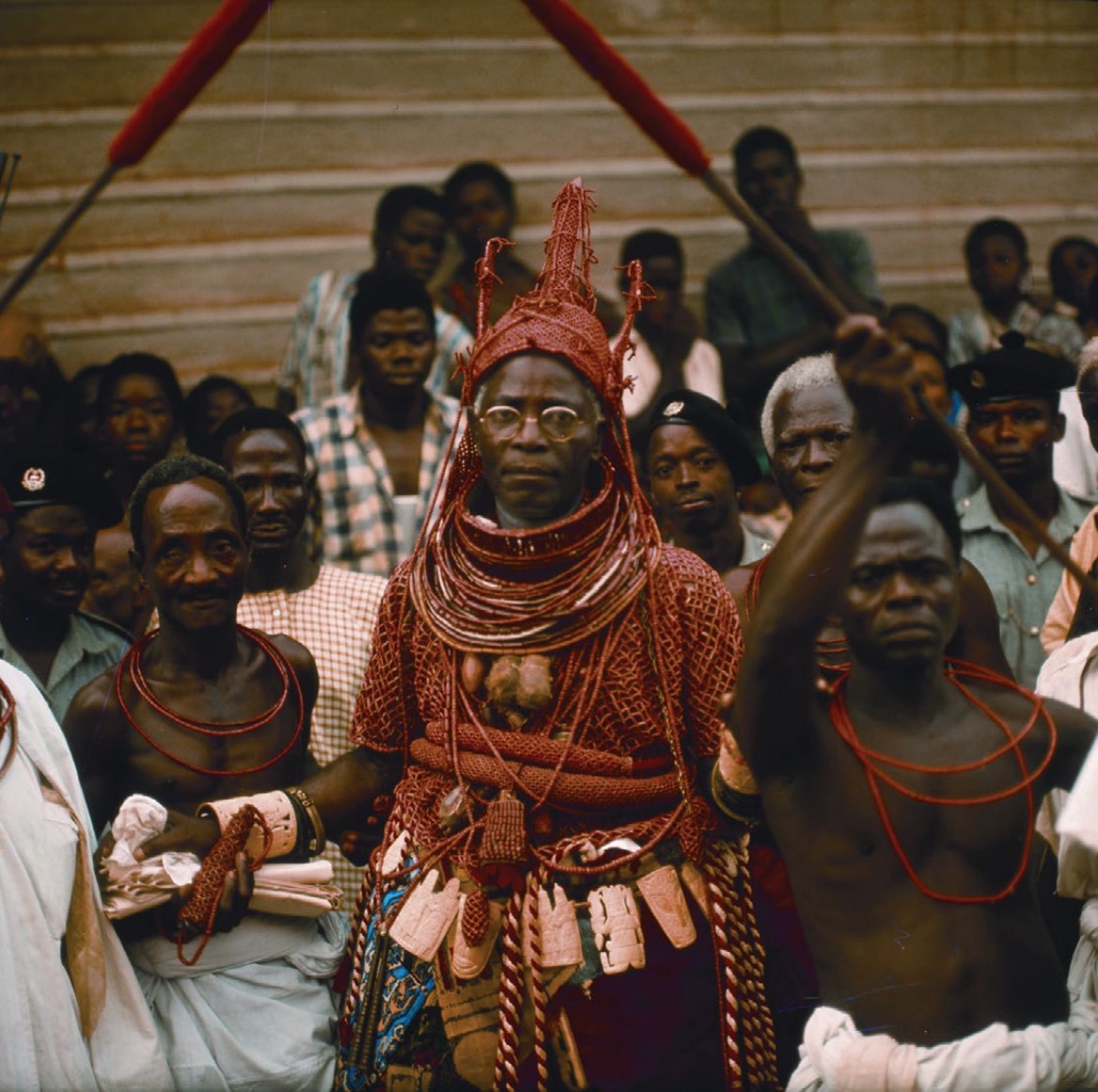 - The Oba: Central figure, wearing coral bead regalia and a high collar.