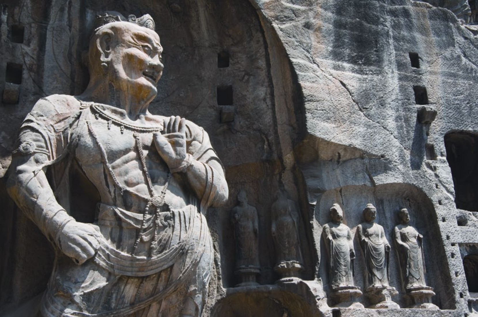 "The Empress and the Cosmic Buddha. Carved into cliffs along the Yi River, this massive complex reached its peak under Empress Wu Zetian. The colossal Vairocana Buddha—whose face might be modeled on the Empress herself—represents the universal, all-encompassing nature of Buddhism and the state."
