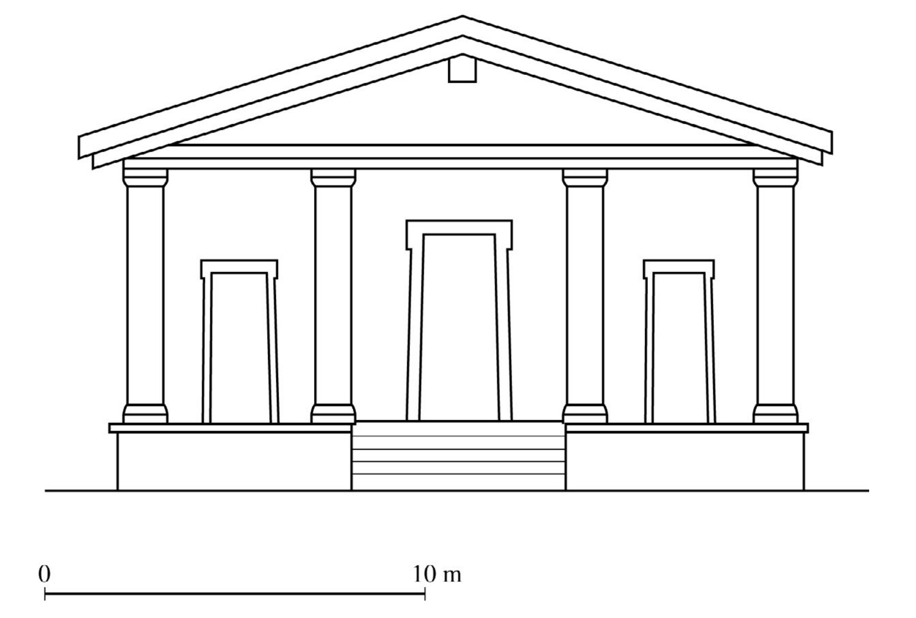 - Constructed of ephemeral materials: wood (columns/roof), mud brick (walls), and tufa (foundation).