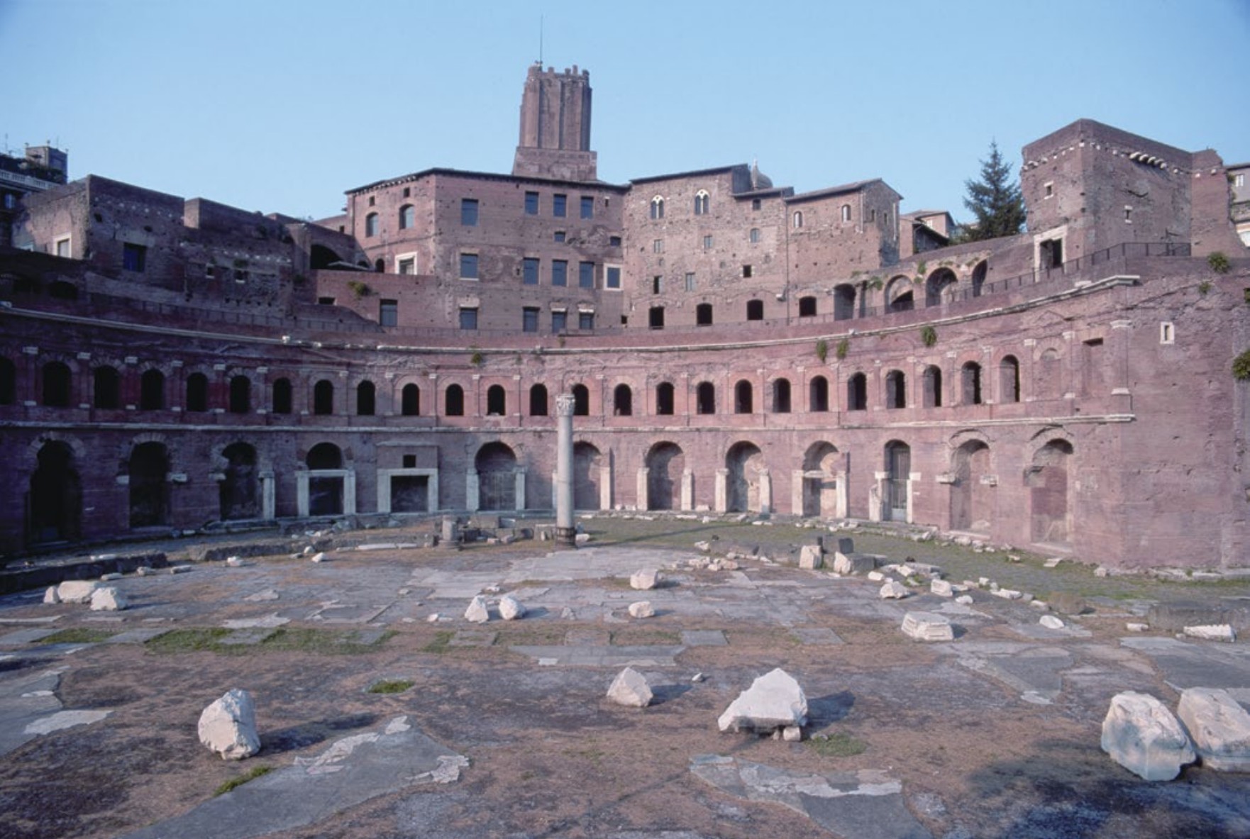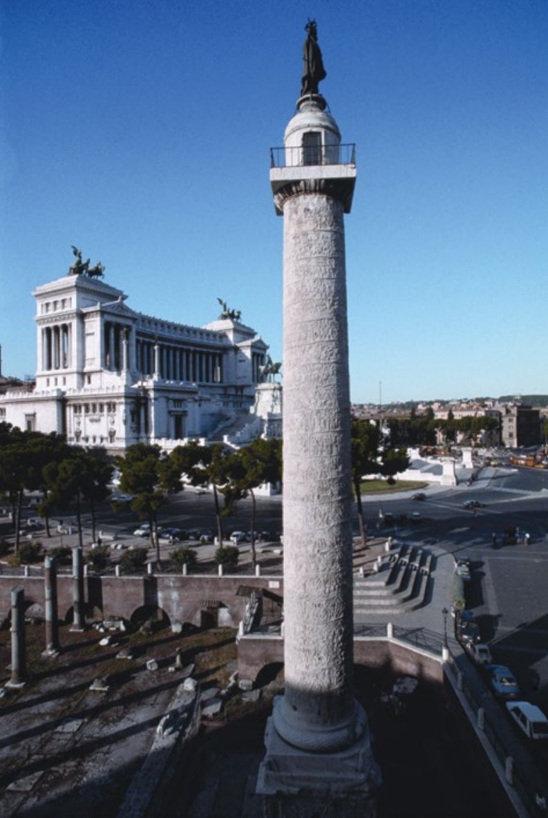"Paid for by the spoils of the Dacian Wars. It included a massive multi-story market complex (the first shopping mall) and a 125-foot column that tells the story of the war like a continuous film scroll."