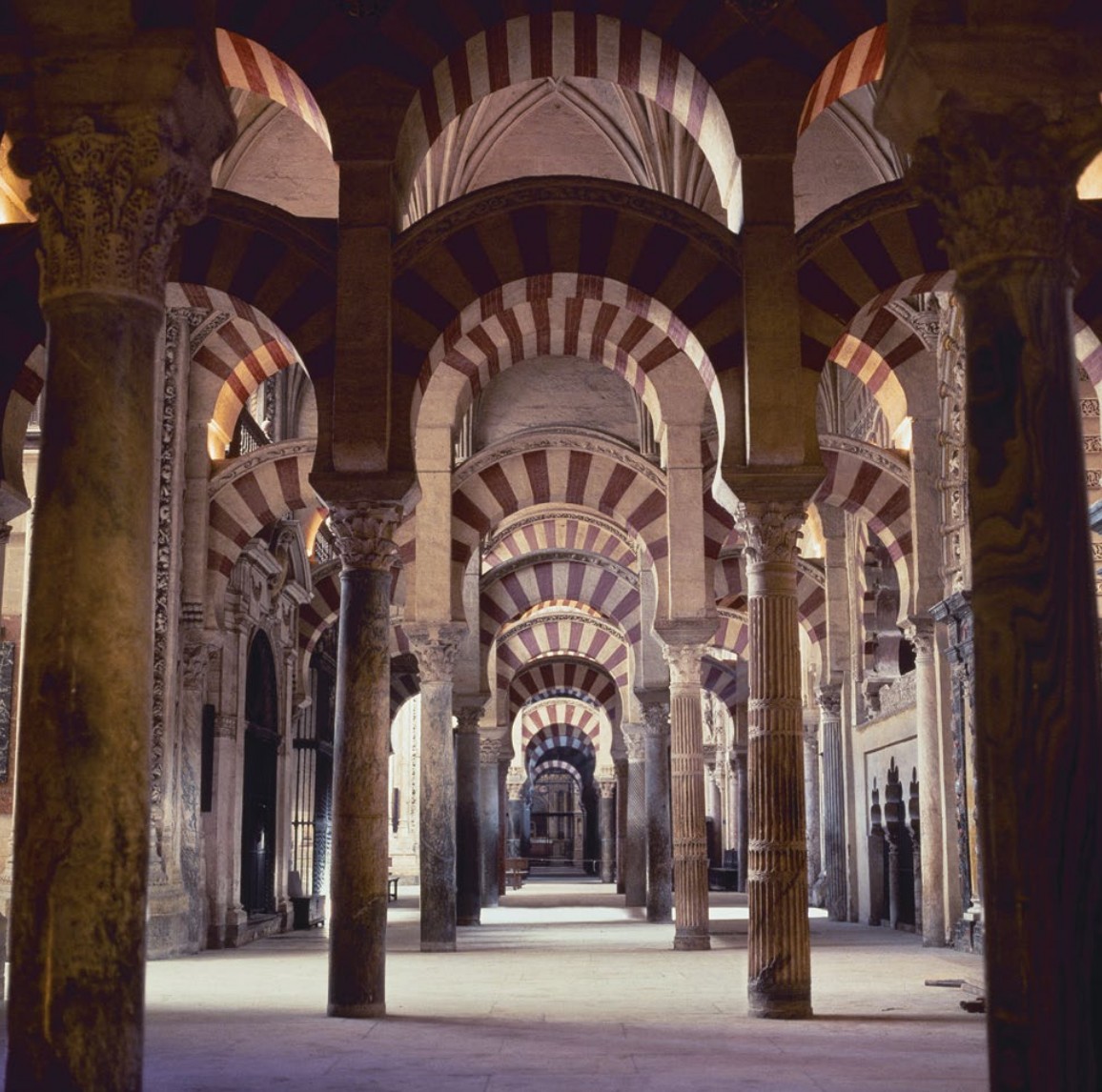 "A symbol of the Umayyad glory in Al-Andalus (Spain). It is famous for its vast hypostyle hall with unique double-tiered arches (red brick/white stone) that create a sense of infinity. It reuses Roman columns (spolia). Later, a Christian cathedral was built vertically right in the middle of it, creating a jarring architectural clash."