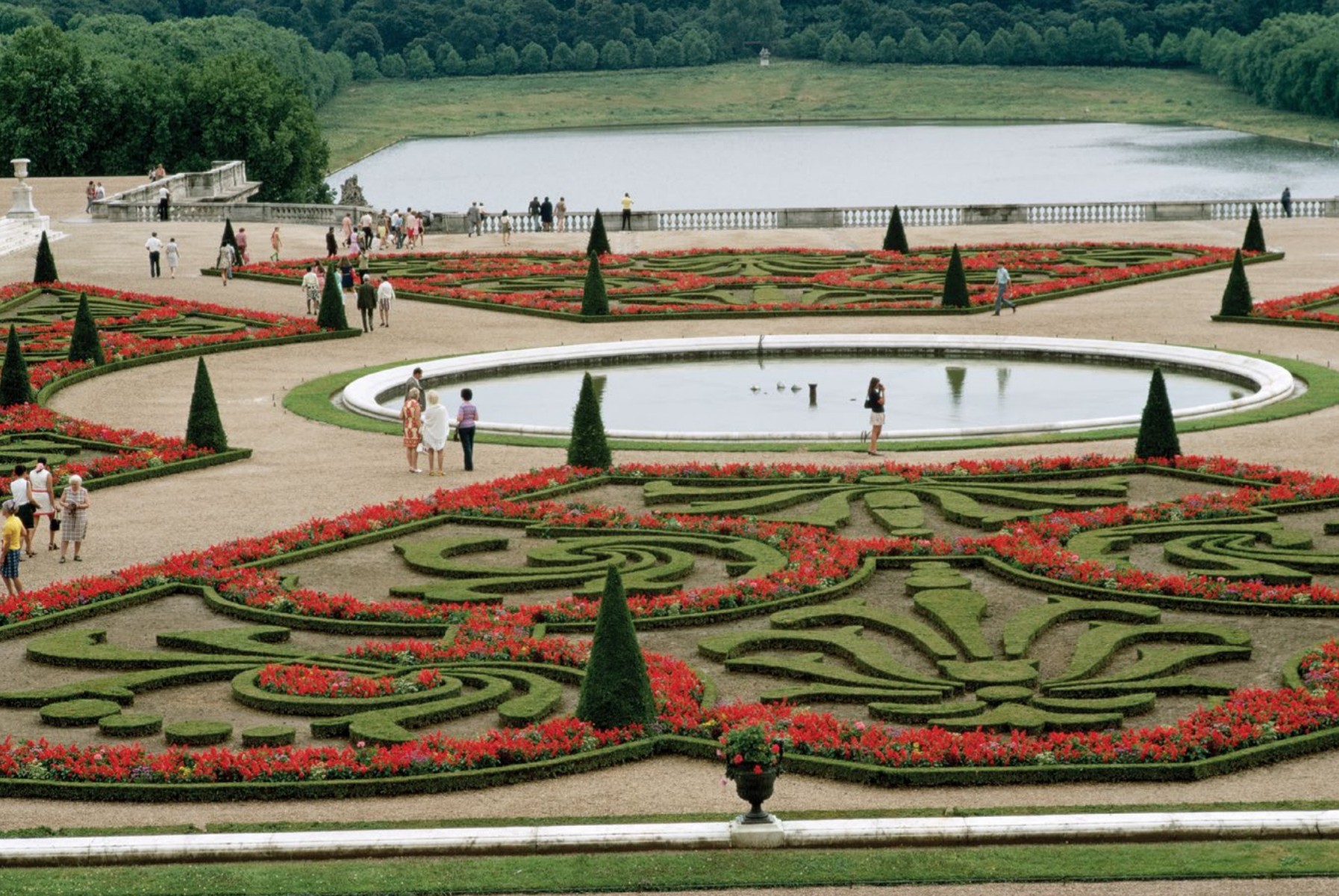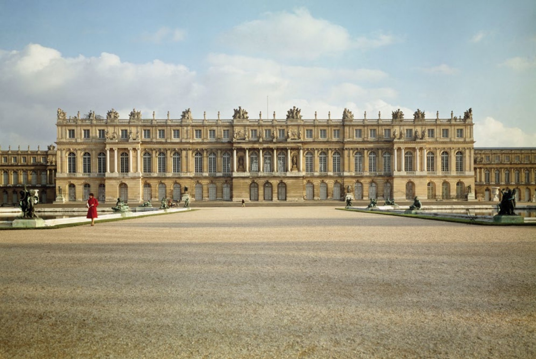 - Gardens: Geometric lines, fountains, axis stretching to infinity.
