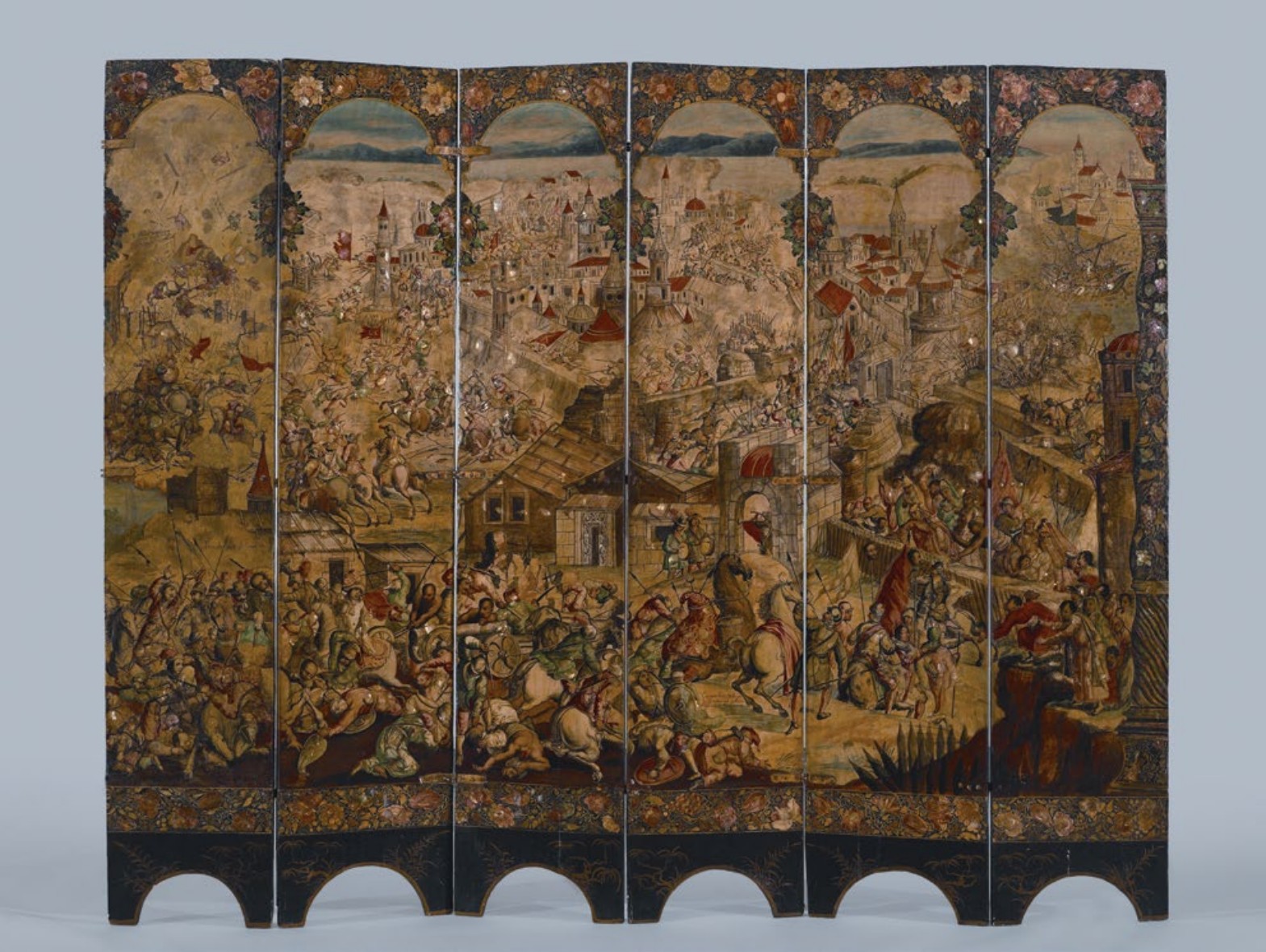 Screen Belgrade © González Family. Folding Screen with the Siege of Belgrade (front) and Hunting Scene (reverse), ca.1697-1701. Oil on wood, inlaid with mother-of pearl, 90 1/2 x 108 5/8 in. (229.9 x 275.8 cm). Brooklyn Museum, Gift of Lilla Brown in memory of her husband John W. Brown, by exchange, 2012.21Screen with the Siege of Belgrade and hunting scene